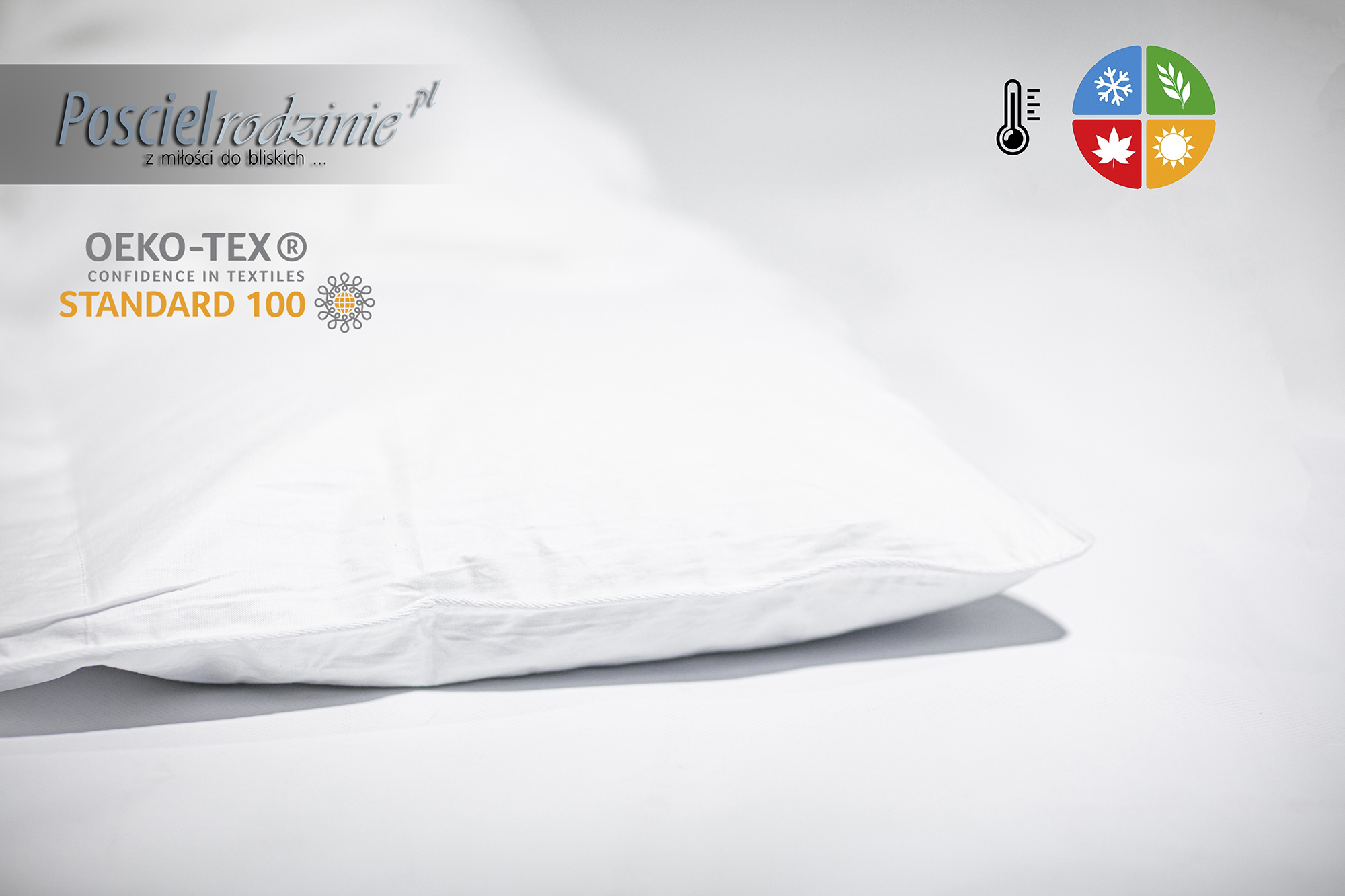 Odpowiednia technika pikowania (w kwadraty), zapobiega zbijaniu się wsadu i w jednolity sposób rozkłada wypełnienie na całej powierzchni. Do środka wszywamy taśmy pełniące funkcję ścianek rozdzielających. Utrzymują one surowiec w danej komorze, zapobiegają jego przemieszczaniu się i tworzeniu się tzw. „zimnych stref”. Całości dopełnia technologia gwarantująca oddychającą powierzchnię kołdry. Jej zastosowanie, w połączeniu ze specjalnym materiałem, jakim jest bawełna o wysokiej gramaturze (specjalny typ bawełnianego inletu), sprawia, że produkt nie tylko swobodnie przepuszcza powietrze i dobrze rozprowadza temperaturę, ale także usuwa nadmiar wilgoci. Dodatkowo tkanina o bardzo wysokiej gramaturze 130g/m2 nie pozwala drobniutkim piórkom wydostać się na zewnątrz. Jej ogromną zaletą jest termoregulacja. Usuwa nadmiar ciepła i nie pozwala na przegrzanie się, a w razie zimna wyizoluje i utrzyma optymalną temperaturę ciała. Nasze wyroby wykańczamy bardzo starannie, uważnie kładąc każdy ścieg, a do wzmocnienia brzegów używamy solidnej i gustownej białej bizy. Do produkcji naszych kołder używamy bawełny z certyfikatem OEKO-TEX® Standard 100. Dobra jakość za dobrą cenę.