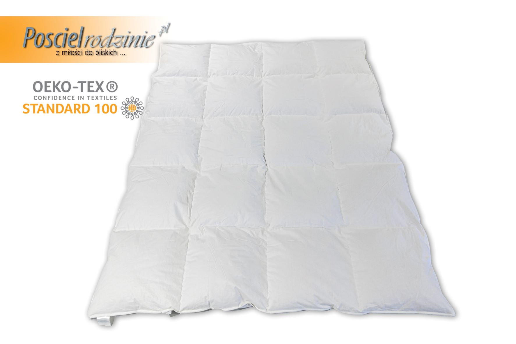 Struktura materiału - Jako materiał wsypowy wykorzystujemy 100% bawełnę puchoszczelną premium. Jest to specjalny typ bawełnianego inletu, który charakteryzuje się bardzo wysoką gramaturą 130g/m2, dzięki czemu drobniutki puch nie ma szans wydostać się na zewnątrz, jednocześnie cała kołdra „oddycha”. Dodatkowo do wzmocnienia brzegów stosujemy bizę w kolorze białym. Do produkcji naszych kołder używamy bawełny z certyfikatem OEKO-TEX® Standard 100.