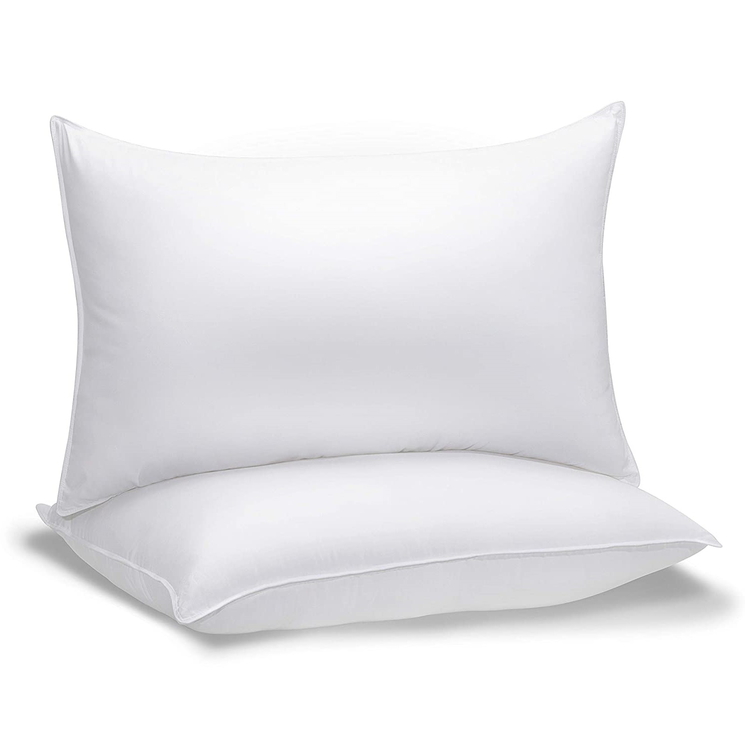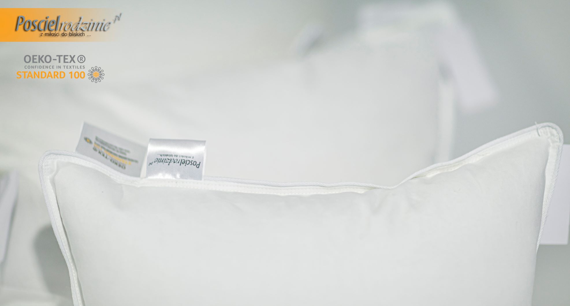 Struktura materiału - Jako materiał wsypowy wykorzystujemy 100% bawełnę puchoszczelną. Jest to specjalny typ bawełnianego inletu, który charakteryzuje się bardzo wysoką gramaturą 135g/m2, dzięki czemu drobniutki puch i pierze nie wydostają się na zewnątrz, jednocześnie cała poduszka „oddycha”. Dodatkowo do wzmocnienia brzegów stosujemy bizę w kolorze białym. Stosujemy wsypy z certyfikatem OEKO-TEX® Standard 100.